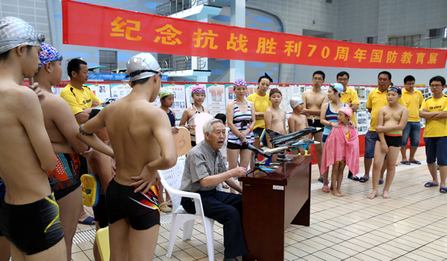 日前, 在中国人民解放军建军八十二周年来临之际。沧州游泳馆特邀请革命老前辈我市爱国主义教育宣传员李汝明老人,结合多年积攒的图片及实物,举行了《纪念抗战胜利70周年国防教育展》,为游泳爱好者和工作人员上了一堂爱国主义教育课。